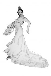Diseñar o plasmar una imagen que se ilustra en la cabeza es belleza. Es como crear una coreografía de un bailarín en un papel. Un paso, un gesto, darle vida a un lienzo en blanco. Que las líneas sean exactas, proporcionadas. Para que haya una armonía en los trazos, debe de conocerse la técnica. También hay que plasmar una emoción, un sentimiento, lo propio del artista. El talento al servicio del arte. Es algo maravilloso. A esta ilustración flamenco erótica la llamamos «La bailaora del Perchel». Es portada de la web de Fetiche Flamenco y nos encanta.