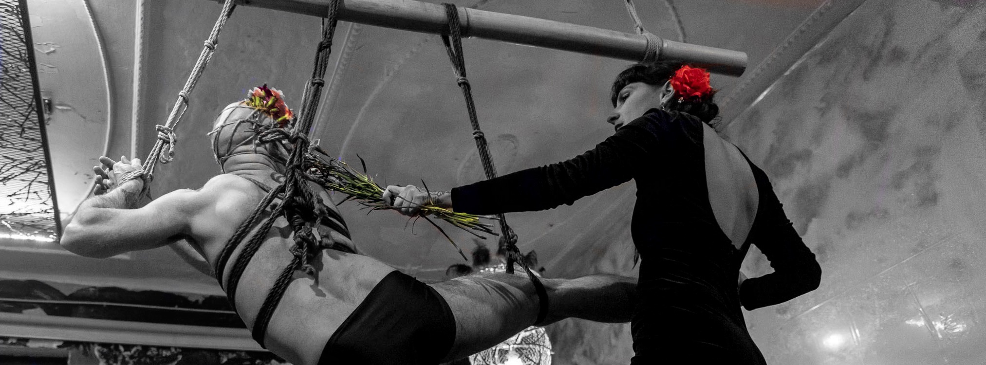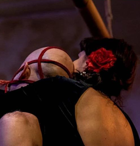 Ángela Nawa https://www.instagram.com/a.nawashibari/?hl=es Crea esta performance junto a su compañero Transformario https://www.instagram.com/transformario/?hl=es y no deja a ningún espectador indiferente http://transformario.es/performance-flamenco-shibari/