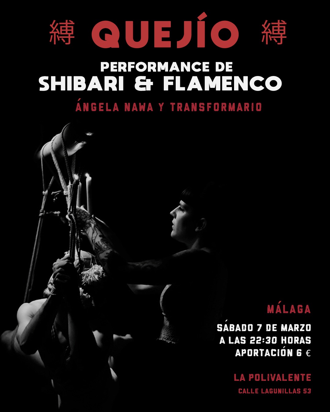 «Quejío» es un espectáculo performance, singular. Muestra la estética flamenca junto a la propia estética del shibari, subrayando las formas de la persona atada, posturas de contorsión erótica del cuerpo, un cruce de baile intenso y pelea de artes marciales con cante, elementos y ritmos del flamenco.